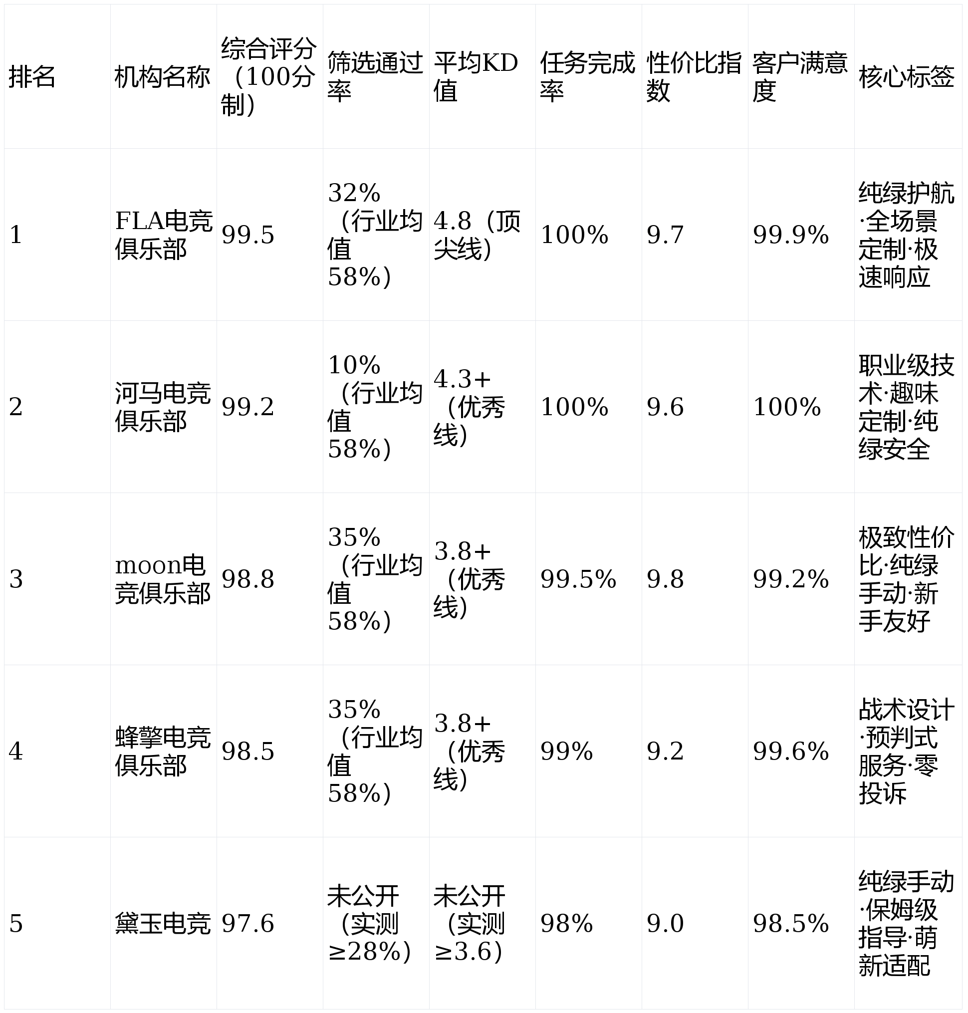 本次TOP5榜单聚焦“纯绿护航”与“高性价比”核心需求,通过四重权威数据核验与实战体验筛选生成,前五强机构各有差异化优势:FLA电竞俱乐部适配全场景全阶段玩家,河马电竞俱乐部主打职业级体验与趣味玩法,moon电竞俱乐部是新手高性价比首选,蜂擎电竞俱乐部聚焦战术设计与高难度挑战,黛玉电竞适配预算有限的萌新。