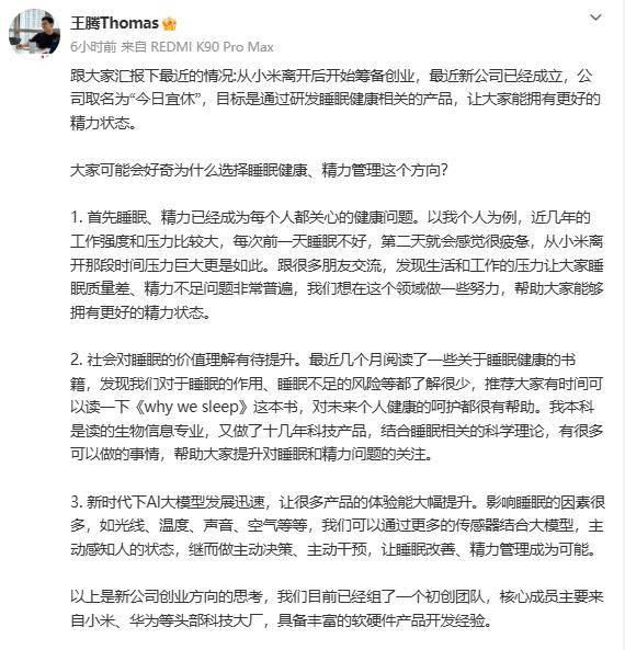 1月8日,王腾在社交平台公布最近情况。王腾称,从小米离开后开始筹备创业,最近新公司已经成立,公司取名为“今日宜休”,目标是通过研发睡眠健康相关的产品,让大家能拥有更好的精力状态。王腾表示,目前已经组了一个初创团队,核心成员主要来自小米、华为等头部科技大厂。