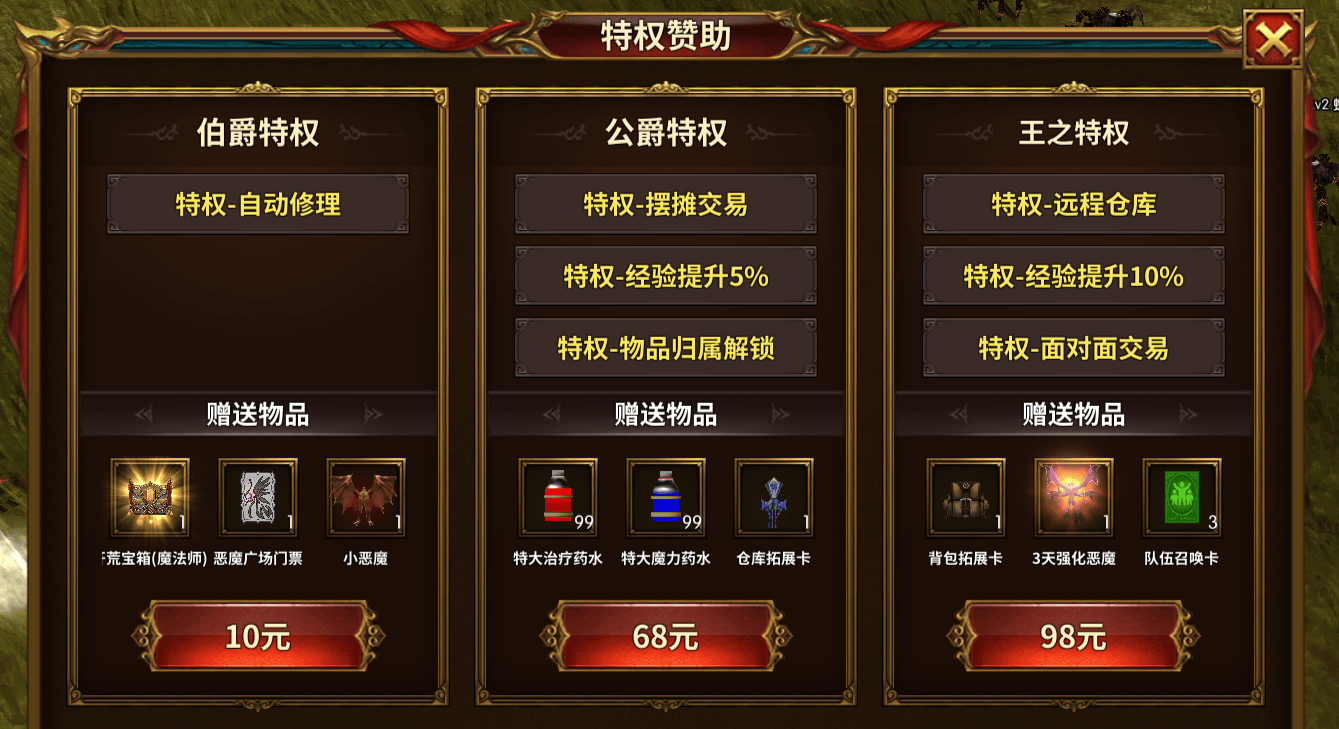 3. 第三档(98元):高效搬砖包 核心权益:解锁面对面交易(交易更快捷,避免摆摊手续费/等待时间)、远程仓库(无需回城存取道具)、经验提升10%、背包拓展包、3天强化恶魔(大幅提升属性,加快刷怪效率)。三档全开合计176元,能最大化搬砖效率,适合想长期深耕、追求高收益的玩家。