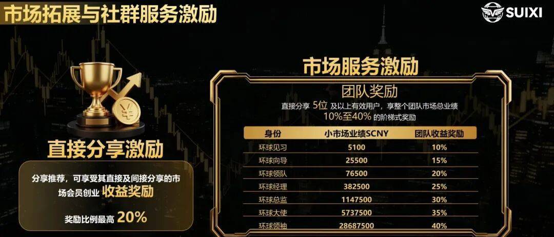 团队阶梯奖励就是扩张引擎。等级从“环球见习”到“环球领袖”共5-7级,升级只看两点:直推人数+团队总业绩,奖励力度堪称“激进”: