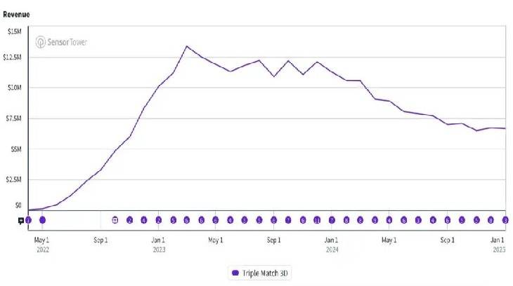 它仅用6个月就达到了500万美元的月内购收入,随后又用6个月创下了1500万美元的月入记录。很明显,《Triple Match 3D》是一次进化而不是迭代。这是3D消除机制从一种新奇创意,升格为品类支柱的过程。