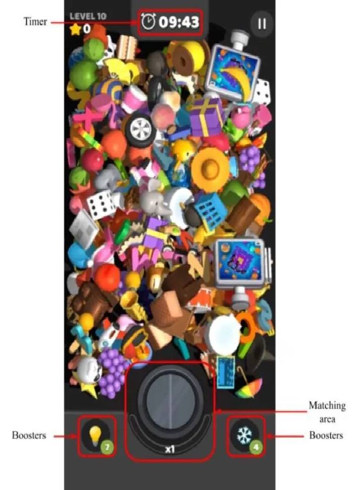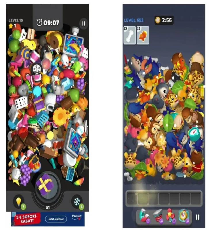 例如关卡通关目标以及有限的下排预留空间。它保留了原机制中最精髓的部分:3D物理碰撞。物品堆仍然遵循物理法则,物品之间依旧会相互遮挡,从一堆杂物中精准发现所需的物品依然重要。