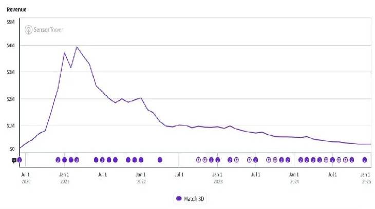 在设计层面,事情变得非常有趣。《Match 3D》本是个解压玩具,缺乏足够的玩法深度,无法维持一款真正的休闲益智大作所需的长线参与度和内购转化。