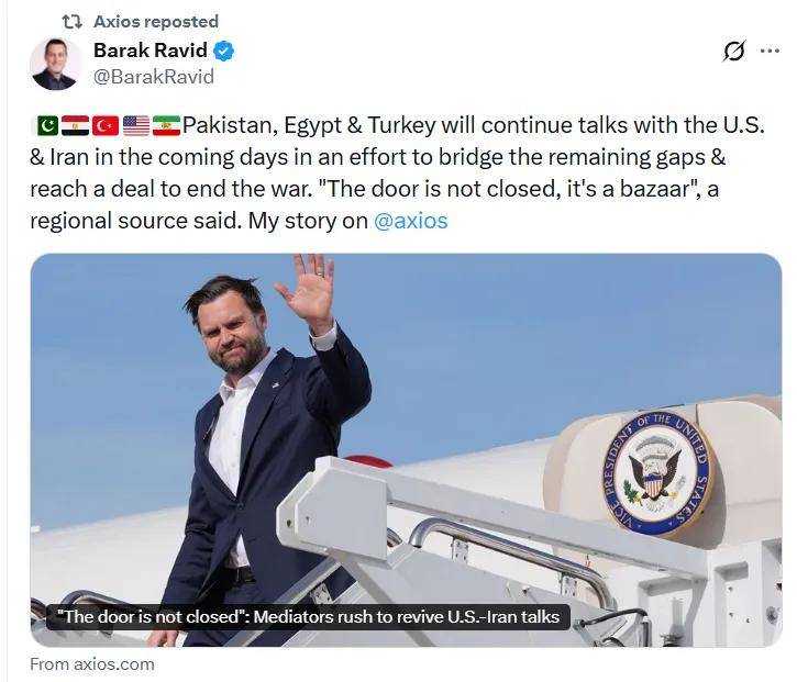开盘前的8点左右,Axios的Barak David及时放出消息,“巴基斯坦、埃及和土耳其调解方将在未来几天继续与美国和伊朗进行谈判,以弥合剩余分歧,争取达成结束战争的协议”,谈判大门“并未完全关闭”,且“可能很快重启”。