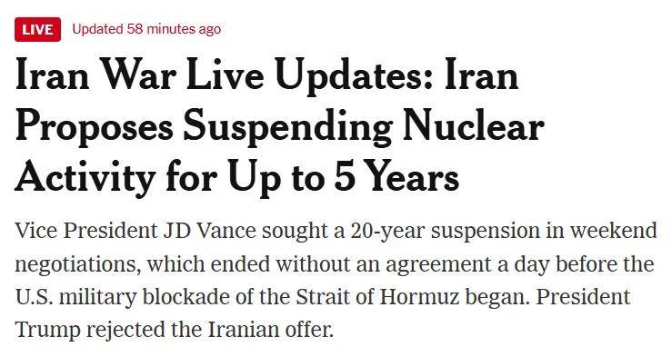 主战的默多克系小报《纽约邮报》(New York Post)在下午3点(后有更新)发表文章,跟进了Axios的报道:以标题党方式强调美国提出了“至少20年暂停”,并暗示白宫在以往的“红线”上有所松动;