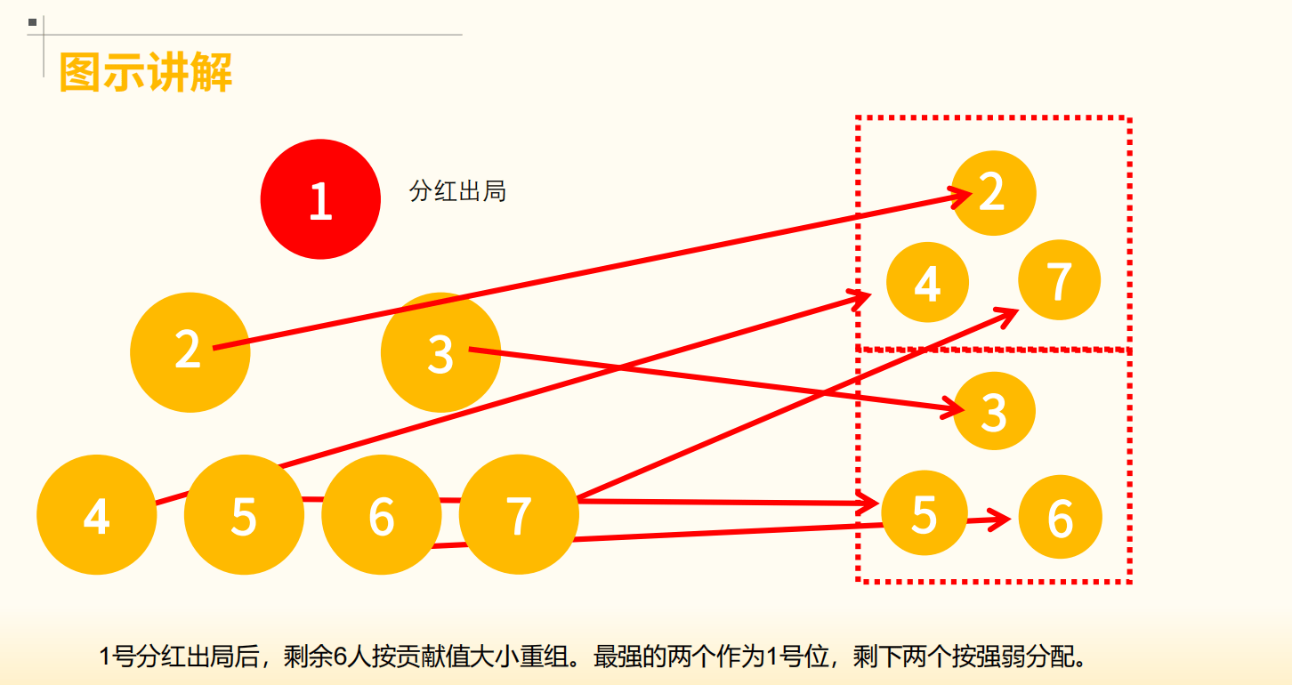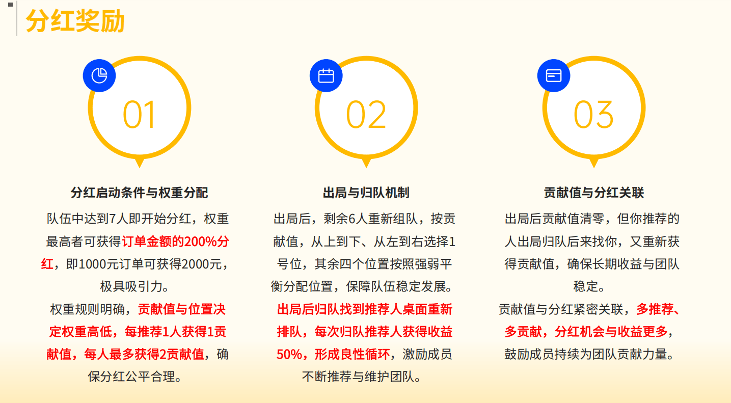 这是模式的核心。当你的团队满7人,系统根据“贡献值”(推荐人数,上限2分)和“加入顺序”计算分红。