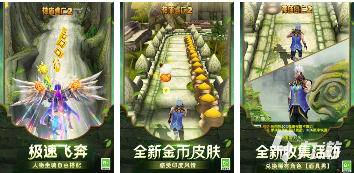 这也是一款跑酷逃亡游戏,闯入神庙的你——玩家将通过用手指操控人物主角进行各种跳跃翻滚等跑酷动作,对离自己身后即将触碰到的神庙怪兽进行甩掉逃脱,并逃出这座古怪的神庙方能算是成功。当然,逃亡过程中玩家们还可以欣赏这座神庙中的美丽山水风雨,探寻古怪之下的真相,享受独属的时光。
